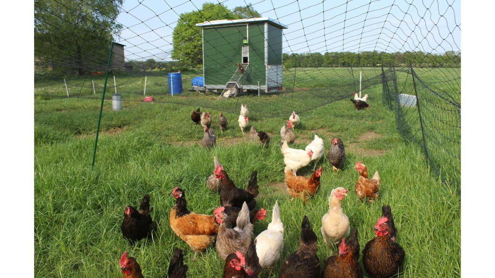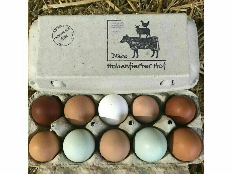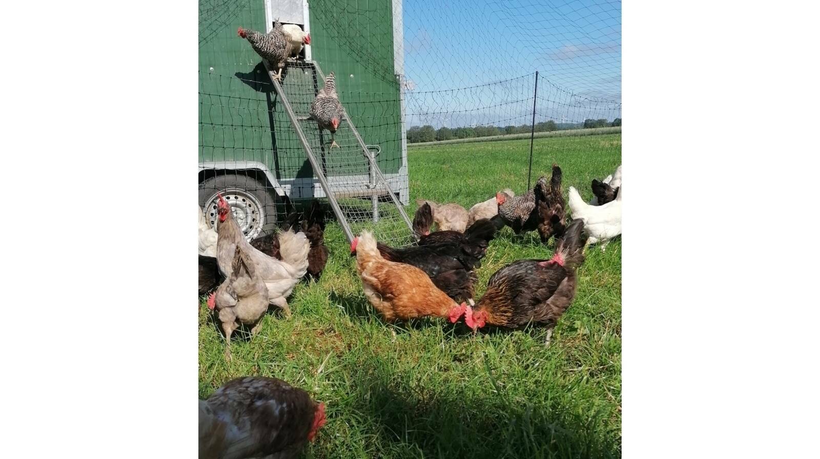 Seit 2021 lebt eine bunte Herde Hühner auf unserem Betrieb. Sie leben in einem Hühnermobil mit täglichem Zugang zur Weide. Das besondere an unseren Hühnern sind die bunten Eier, die sie legen. Wir setzten dazu nicht auf die klassischen braunen Legehybriden sondern einen bunten Mix an Rassen. Damit wollen wir auch den Fokus wieder auf Doppelnutzungshühner (also solche sowohl viele Eier legen, als auch eine gute Mastleistung haben) setzten.
